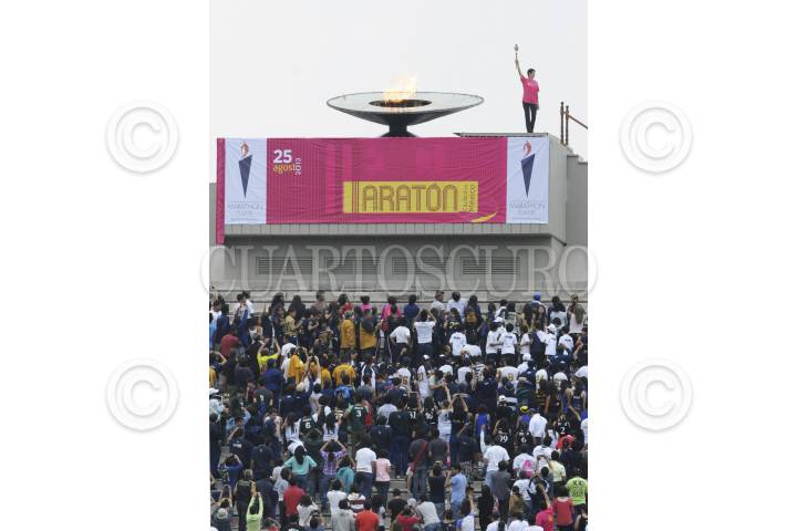 MÉXICO, D.F., 24AGOSTO2013.- José Narro Robles, rector de la UNAM, y el nadador paralímpico Gustavo Sánchez, durante la ceremonia del encendido de la falama del pebetero del Estadio Olímpico Universitario en una ceremonia que sirvió como preludió a la celebración del XXXI edición Maratón Internacional de la Ciudad. La llamada "Flama de Maratón, símbolo de la paz mundial, paseo por la ciudad, para culminar en el histórico estadio de las Olímpiadas del 68. FOTO: CUARTOSCURO.COM