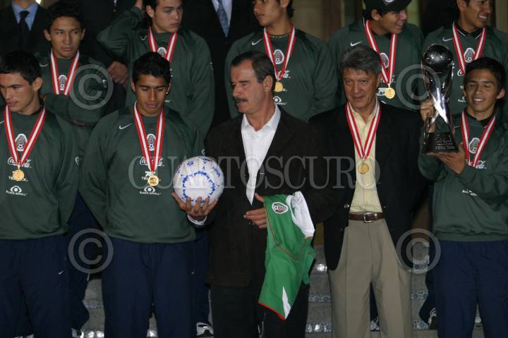 MEXICO, D.F. 03OCTUBRE2005.- Xochilt Galvez, secretaria de asuntos indigenas, festeja con integrantes la Sub-17 su triunfo como campeones Mundiales de la especialidad. FOTO: Nelly Salas/CUARTOSCURO.COM