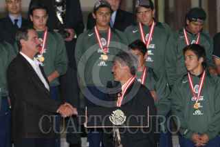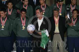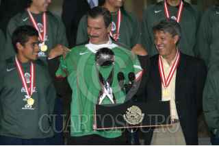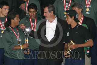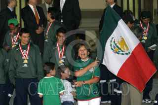 MEXICO, D.F. 03OCTUBRE2005.- Xochilt Galvez, secretaria de asuntos indigenas, festeja con integrantes la Sub-17 su triunfo como campeones Mundiales de la especialidad. FOTO: Nelly Salas/CUARTOSCURO.COM