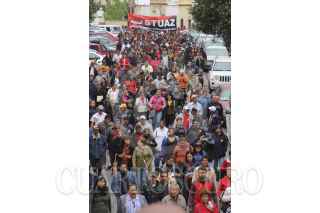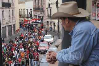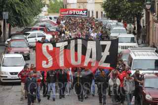 ZACATECAS, ZACATECAS, 27AGOSTO2013.- Más de mil trabajadores pertenecientes al Sindicato de Trabajadores de la Universidad Autónoma de Zacatecas (STUAZ) marcharon la mañana de este martes desde la Unidad Académica de Ingeniería hasta el patio de la Rectoría de la UAZ para exigir que se transparenten los gastos que han endeudado a la UAZ. Un día después de la renuncia del rector Armando Silva Cháirez, la institución continúa en crisis económica y labora ahora con el descontento de trabajadores y académicos. FOTO: ALEJANDRO ORTEGA NERI /CUARTOSCURO.COM