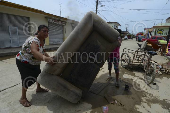 SAN RAFAEL, VERACRUZ., 28AGOSTO2013.- Habitantes del municipio de San Rafael que no necesitaron acudir al albergue ubicado en el palacio municipal, realizan labores de limpieza en sus hogares tratando de recuperar algunas de sus pertenencias tras el paso de la tormenta tropical Fernand. Así mismo rellenaron con tierra y piedras un deslave del puente San Rafael que se deslavó dejando incomunicada la zona. FOTO: RUBÉN ESPINOSA / CUARTOSCURO.COM