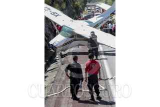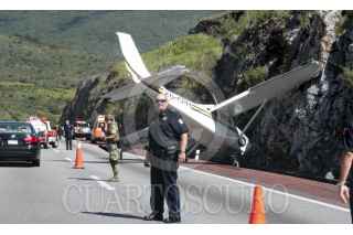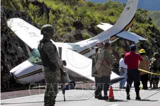 CHILPANCINGO, GUERRERO, 28AGOSTO2013.- Una avioneta que volaba del puerto de Acapulco con destino a Cuernavaca Morelos, el piloto y el copiloto tuvieron que hacer un aterrizaje forzoso debido a una supuesta falla mecánica tuvieron que aterrizar en uno de los carriles dela autopista del sol. El aterrizaje se llevó acabo en el kilómetro 288, a la altura de la población Palo Blanco municipio de Chilpancingo. La Aeronave se impactó contra un cerro, en esta acción hizo presencia el ejército mexicano, policía municipal, estatal y elementos de protección civil. FOTO: JOSE I HERNÁNDEZ /CUARTOSCURO.COM
