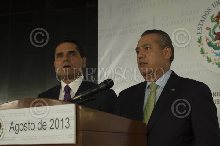 MÉXICO D.F., 28AGOSTO2013.- Los coordinadores legislativos Silvano Aureoles Conejo, PRD y Manlio Fabio Beltrones, PRI, ofrecieron una conferencia de prensa para asegurar que la discusión sobre la ley general del servicio profesional docente, se discutirá en el próximo período ordinario en la Cámara de Diputados, descartando así un posible período extraordinario. FOTO: MOISÉS PABLO /CUARTOSCURO.COM