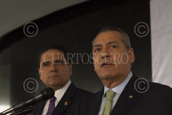 MÉXICO D.F., 28AGOSTO2013.- Los coordinadores legislativos Silvano Aureoles Conejo, PRD y Manlio Fabio Beltrones, PRI, ofrecieron una conferencia de prensa para asegurar que la discusión sobre la ley general del servicio profesional docente, se discutirá en el próximo período ordinario en la Cámara de Diputados, descartando así un posible período extraordinario. FOTO: MOISÉS PABLO /CUARTOSCURO.COM
