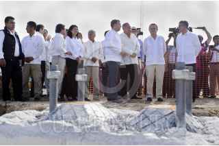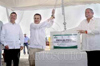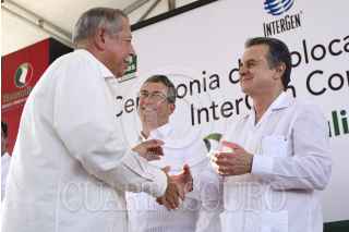 ALTAMIRA, TAMAULIPAS, 28AGOSTO2013.- Pedro Joaquín Coldwell, secretario de Energía de México y Eigidio Torre Cantú, gobernador del estado de Tamaulipas encabezaron la ceremonia de colocación de la "Primera Piedra Intergen Compresión Tamaulipas". FOTO: EMILIANO RUVAL /CUARTOSCURO.COM
