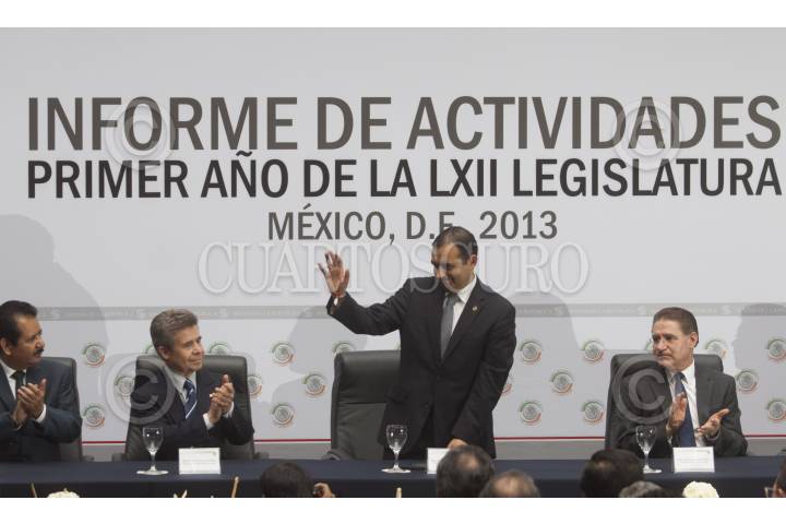 MÉXICO, D.F., 29AGOSTO2013.- Ernesto Cordero, presidente de la mesa directiva del Senado de la República, presento el informe de actividades del primer año de actividades de la LXII Legislatura. En la imagen Luis Videgaray, secretario de Hacienda, lo felicita ya que el próximo sábado concluye su periodo al frente de la Cámara Alta. FOTO: MOISÉS PABLO /CUARTOSCURO.COM