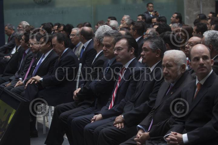 MÉXICO, D.F., 29AGOSTO2013.- Ernesto Cordero, presidente de la mesa directiva del Senado de la República, presento el informe de actividades del primer año de actividades de la LXII Legislatura. En la imagen Luis Videgaray, secretario de Hacienda, lo felicita ya que el próximo sábado concluye su periodo al frente de la Cámara Alta. FOTO: MOISÉS PABLO /CUARTOSCURO.COM