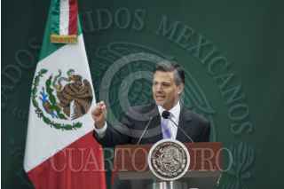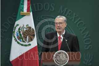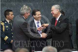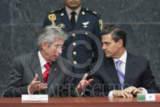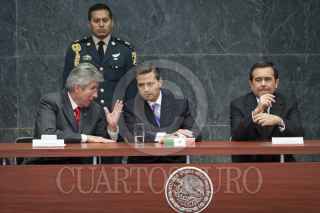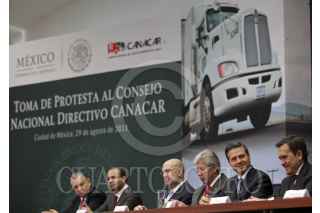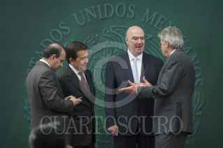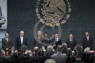 MÉXICO D.F., 29AGOSTO2013.- El presidente Enrique Peña Nieto acompañado de los secretarios del Trabajo, Alfonso Navarrete Prida; de Medio Ambiente, José Guerra Abud; de Comunicaciones y Transportes, Gerardo Ruíz Esparza y de Economía, Ildefonso Guajardo durante el evento de Toma de Protesta al Consejo Nacional Directivo de la Cámara Nacional del Autotransporte de Carga (CANACAR) que se realizó en el salón Adolfo López Mateos de la Residencia Oficial de Los Pinos. FOTO: PRESIDENCIA /CUARTOSCURO.COM