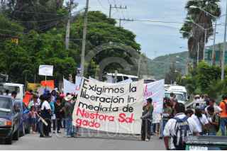 CHILPANCINGO, GUERRERO, 02SEPTIEMBRE2013.- Policías Comunitarios de Tixtla y Olinala, de la Coordinadora Regional de Autoridades Comunitarias (CRAC), salieron en caravanas de camionetas hacia la capital del estado, donde llevaron una marcha del parque Margarita Maza de Juárez, hacia el zócalo, apostándose en frente de instituciones bancarias y de un local de hamburguesas, colocaron mantas y llevaron a cabo un mitin, en el que enfatizaron la liberación del comandante regional Nestora Salgado García, así como de policías comunitarias, y, la presentación de 2 policías comunitarios que desaparecieron, Gonzalo Molina dijo están encarcelados o ya los ejecutaron sabemos cómo se las gasta el gobierno, después de permanecer ahí por espacio de una hora. Los manifestantes continuaron la marcha por la avenida Lázaro Cárdenas con dirección al congreso, para manifestarse ahí, frente a las instalaciones del poder ejecutivo, al arribar ahí trabajadores y diputados salieron con prontitud del recinto, entre ellos el diputado Héctor Astudillo Flores, quien salía acompañado de por lo menos 10 trabajadores del congreso de guerrero. FOTO: JOSÉ I. HERNÁNDEZ /CUARTOSCURO.COM