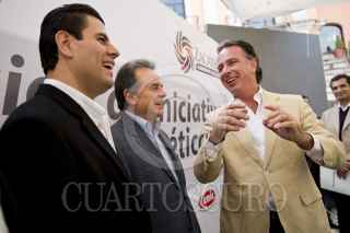 ZACATECAS, ZACATECAS, 04SEPTIEMBRE2013.- Miguel Alonso Reyes, Gobernador de Zacatecas; Pedro Joaquín Coldwell, Secretario de Energía y el vicepresidentes de CONCAMIN, Giovanni Aloi; platican durante la firma de convenio entre Mexico Power Group y Volkswagen de México el cual consiste en ampliar la capacidad instalada de generación eólica del país. El evento se llevó acabo en un conocido hotel de la capital y también fue encabezado por los presidentes de dichas empresas. FOTO: MISAEL VALTIERRA / CUARTOSCURO.COM