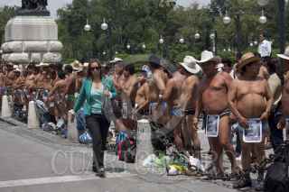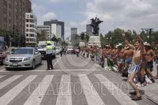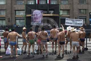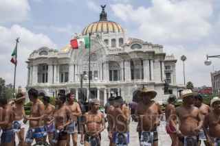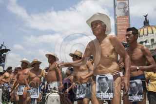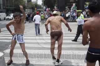 MÉXICO, D.F. 05SEPTIEMBRE2013.- Los 400 Pueblos organización social proveniente del estado de Veracruz se manifestaron en la inmediaciones del Palacio de Bellas Artes, ubicado en avenida Juárez y Eje Central, los manifestantes estaban en calzones ataviados con una fotografía del ex Jefe de Gobierno Marcelo Ebrard calificándolo de represor, también colocaron una foto del ex Secretario de Seguridad Pública del DF Manuel Mondragón, actual Comisionado Nacional de Seguridad. FOTO: MOISÉS PABLO /CUARTOSCURO.COM