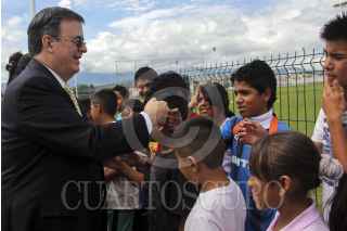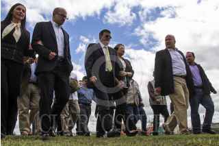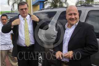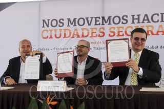 TLAJOMULCO DE ZÚÑIGA, JALISCO, 09SEPTIEMBRE2013.- Marcelo Ebrard Casaubón, Presidente de la Comisión de Ciudades Seguras de la Organización de las Naciones Unidas (ONU) y ex Jefe de Gobierno del Distrito Federal, junto a Enrique Alfaro, ex alcalde del municipio, e Ismael del Toro, actual Presidente Municipal de Tlajomulco durante su visita a la entidad. Los mandatarios firmaron un convenio que permite la proximidad entre Tlajomulco y las tres mil 500 ciudades del planeta que se han sumado al modelo de ciudades seguras encabezado por Ebrard. FOTO: FERNANDO CARRANZA GARCÍA /CUARTOSCURO.COM