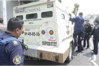 MÉXICO, D.F., 10SEPTIEMBRE2013.- La camioneta de valores de Tecnoval numero 667 fue asaltada por su conductor que fingió la descompostura de la camioneta en la Av. La Viga y taller donde encerró a su copiloto y amago a su compañero que viaja en la aparte de atrás para exigirle el dinero para darse a la fuga en una camioneta que lo seguía. FOTO: LUIS CARBAYO /CUARTOSCURO.COM