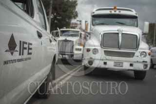 MÉXICO, D.F., 10SEPTIEMBRE2013.- Tras la llegada del primer convoy de boletas electorales a la empresa Bio Papel en la avenida Poniente 140 en la colonia Vallejo alrededor de las 14:30 horas, autoridades del Instituto Federal Electoral pasaron mas de 4 horas realizando una serie de tramites mismos que versiones extraoficiales mencionaron que al no llegar a un acuerdo con la empresa misma que anunciaron del dia de ayer seria la encargada de triturar los mas de 150 toneladas de material electoral de 2005-2006, los tres camiones que contenían este primer viaje, regresaran a la bodega Nacional del IFE ubicada en Tepotzotlan a la espera de encontrar otra empresa que realice la labor de destrucción del material electoral. FOTO: ENRIQUE ORDÓÑEZ /CUARTOSCURO.COM