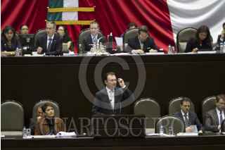 MÉXICO D.F., 11SEPTIEMBRE2013.- Luis Videgaray, titular de la Secretaria de Hacienda, compareció ante el pleno de la Cámara de Diputados. Durante la comparecencia diputados del PRD mostraron unas mantas alusivas al aumento de impuesto en renta, colegiaturas y a la privatización de PEMEX. FOTO: GUILLERMO PEREA /CUARTOSCURO.COM