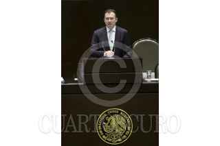 MÉXICO D.F., 11SEPTIEMBRE2013.- Luis Videgaray, titular de la Secretaria de Hacienda, compareció ante el pleno de la Cámara de Diputados. Durante la comparecencia diputados del PRD mostraron unas mantas alusivas al aumento de impuesto en renta, colegiaturas y a la privatización de PEMEX. FOTO: GUILLERMO PEREA /CUARTOSCURO.COM