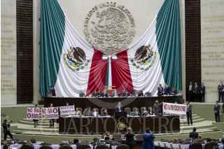 MÉXICO D.F., 11SEPTIEMBRE2013.- Luis Videgaray, titular de la Secretaria de Hacienda, compareció ante el pleno de la Cámara de Diputados. Durante la comparecencia diputados del PRD mostraron unas mantas alusivas al aumento de impuesto en renta, colegiaturas y a la privatización de PEMEX. FOTO: GUILLERMO PEREA /CUARTOSCURO.COM