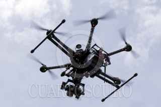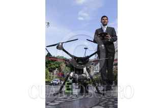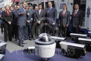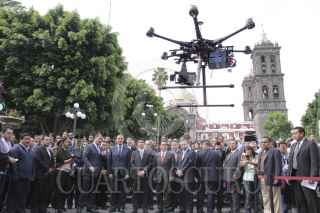PUEBLA, PUEBLA, 12SEPTIEMBRE2013.- Rafael Moreno Valle, gobernador del estado, signó un Convenio de coordinación y colaboración para la Activación de Alerta Amber con el presidente municipal Eduardo Rivera, en donde se presentó el Centro de Mando así como un Octocóptero o "Drone" equipado con una cámara para fortalecer la estrategia de seguridad. FOTO: HILDA RÍOS/ CUARTOSCURO.COM