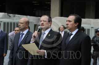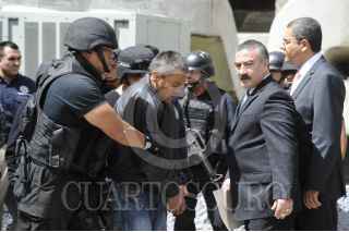 MÉXICO, D.F., 12SEPTIEMBRE2013.- Renato Sales, Procurador del Estado de México y Rodolfo Ríos Garza, Procurador General de Justicia del Distrito Federal (PGJDF), al momento de la recepción que la Procuraduría General de la República (PGR) hizo de varias personas que fueron detenidas y presuntamente están relacionadas con el caso del bar Heaven, en donde fueron asesinados 13 jóvenes y sus cuerpos fueron hallados en un racho del Estado de México el pasado 22 de agosto. Los detenidos fueron identificados por la PGR como Fernando Fernández Sánchez, alías "El Pez", Jonathan Robles González, alías "El John" y Pedro Francisco Paz López, alías "Pancho Pulgas". FOTO: LUIS CARBAYO /CUARTOSCURO.COM