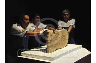 MÉXICO, D.F., 13SEPTIEMBRE2013.- En el Museo de Antropología se presentaron tres piezas de gran tamaño que habían sido saqueadas de México y fueron recuperadas. A través del Programa para Procurar la Recuperación de Bienes Culturales, en el que participan la Secretaría de Relaciones Exteriores, PGR, el INAH y el Instituto Nacional de Bellas Artes fueron recuperadas y serán exhibidas al público, las piezas se encontraban en el Mueos de Arte de Lowe, de la Universidad de Miami, a las que habían sido "donadas". Las obras prehispánicas son: Cabeza de Serpiente (900-1200 d.C), una pieza en forma de serpiente ligada con el poder y la tierra; Tláloc, dios de la lluvia (200-900 d.C.). estela que presenta las típicas anteojeras y cuernillos, y en la mano izquierda pareciera tener rayos, pieza que posiblemente sea originaria de la zona de Guerrero, y Noble o sacerdote (600-200 a.C.), que simboliza a un noble o un sacerdote ataviado con un tocado, que presenta sandalias a un noble o aun sacerdote ataviado con un tocado, que presenta sandalias y pulseras, y que se encuentra parado un elemento que representa un cerro; de acuerdo con los primeros estudios, procede de la costa de Golfo de México. FOTO: INAH/ HÉCTOR MONTAÑO /CUARTOSCURO.COM