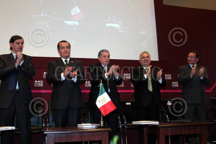 MEXICO, D.F., 11OCTUBRE2005.- María de los Angeles Fromow, fiscal especial para delitos electorales, Heliodoro Díaz, presidente de la Cámara de Diputados, Carlos Abascal, Secretario de Gobernación y Enrique Jackson, presidente del Senado, durante la ceremonia de los XV años de creación del Instituto Federal Electoral. FOTO: Moisés Pablo/CUARTOSCURO.COM