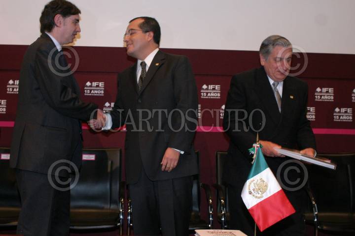 MEXICO, D.F., 11OCTUBRE2005.- María de los Angeles Fromow, fiscal especial para delitos electorales, Heliodoro Díaz, presidente de la Cámara de Diputados, Carlos Abascal, Secretario de Gobernación y Enrique Jackson, presidente del Senado, durante la ceremonia de los XV años de creación del Instituto Federal Electoral. FOTO: Moisés Pablo/CUARTOSCURO.COM