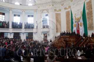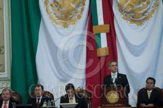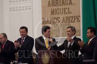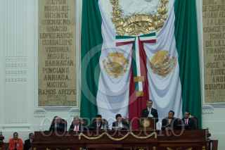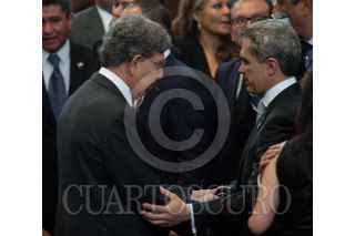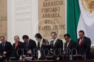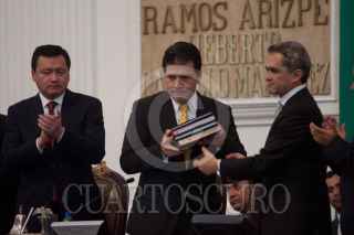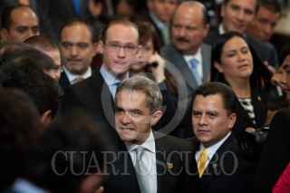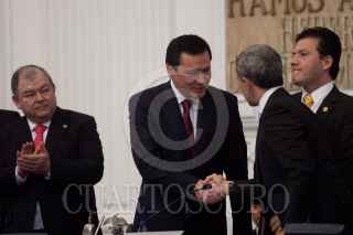 MÉXICO, D.F., 17SEPTIEMBRE2013.- Cuauhtémoc Cárdenas, coordinador de Asuntos Internacionales del Gobierno del Distrito Federal, saluda a Miguel Ángel Mancera, Jefe de Gobierno, quien entregó su 1er Informe de Gobierno ante el pleno de la Asamblea Legislativa del Distrito Federal. FOTO: MOISÉS PABLO /CUARTOSCURO.COM