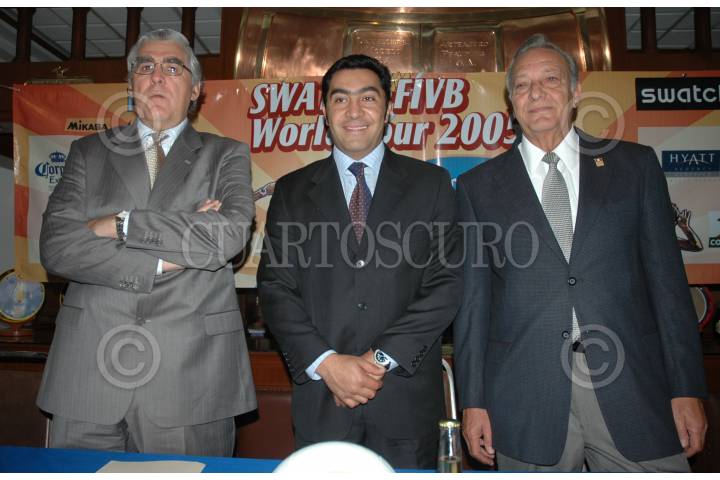 MÉXICO, D.F. 12OCTUBRE2005.- Nelson Vargas, titular de la CONADE, Jorge Camacho y Alejandro Salinas de la Garza durante la presentación del segundo torneo corona acapulco open de volibol. FOTO: Iván Stephens/CUARTOSCURO.COM