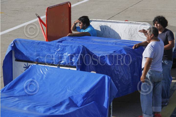 ACAPULCO, GUERRERO, 18SEPTIEMBRE2013.- Dos carros que utilizan las aerolíneas para realizar el transporte de equipaje en el Aeropuerto Internacional de Acapulco. Versiones no oficiales, hicieron mención que presuntamente llevaban los cuerpos de 6 turistas que se dirigían a vacacionar al puerto y murieron durante un deslave causado por la tormenta tropical “Manuel”, mismos que serán llevados a Toluca FOTO: CUARTOSCURO.COM