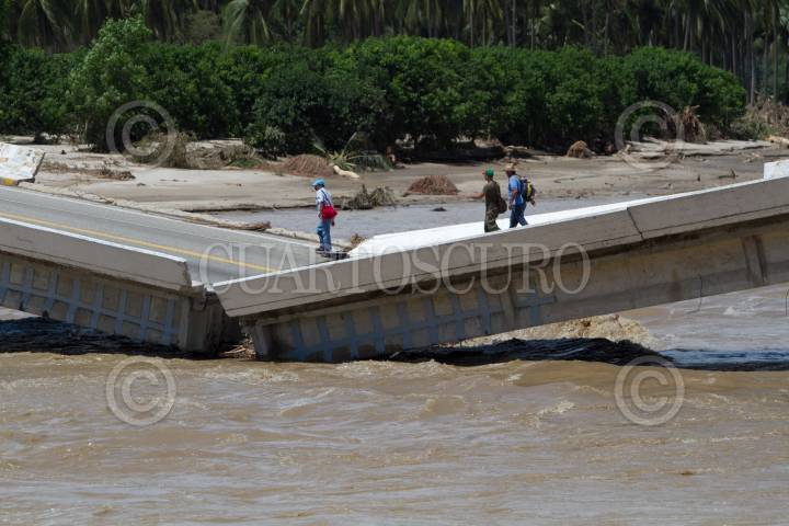 COYUCA DE BENITÉZ, GUERRERO, 18SEPTIEMBRE2013.- Damnificados trasladan víveres y parte de sus pertenencias a pie debido la caída de puente tras la crecida del río Coyuca tras las intensas lluvias provocadas por la tormenta Ingid. FOTO: GUILLERMO PEREA /CUARTOSCURO.COM