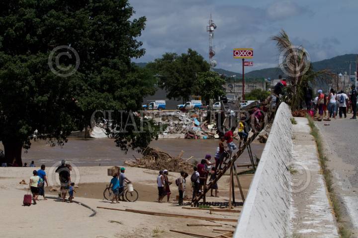 COYUCA DE BENITÉZ, GUERRERO, 18SEPTIEMBRE2013.- Damnificados trasladan víveres y parte de sus pertenencias a pie debido la caída de puente tras la crecida del río Coyuca tras las intensas lluvias provocadas por la tormenta Ingid. FOTO: GUILLERMO PEREA /CUARTOSCURO.COM
