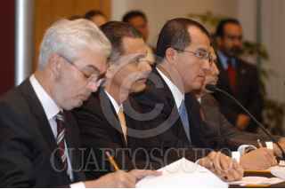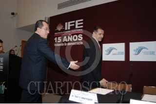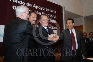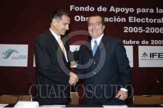 MEXICO, D.F. 12OCTUBRE2005.- Luis Carlos Ugalde, consejero presidente del Instituto Federal Electoral y Carloas Abscal, secretario de Gobernación previo a la firma de convenios para la creación del Fondo de apoyo para la Observación Electoral 2005-2006. FOTO: Germán Romero/CUARTOSCURO.COM
