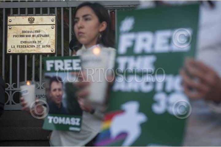 MÉXICO, D.F., 27SEPTIEMBRE2013.- Activistas de Greenpeace organizaron una manifestación afuera de las instalaciones de la Embajada Rusa en México para exigir a las autoridades la liberación de los 30 activistas que permanecen detenidos luego de que realizaron una protesta pacífica en aguas del Ártico ruso el pasado 18 de septiembre. FOTO: DIEGO SIMÓN SÁNCHEZ /CUARTOSCURO.COM