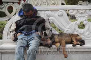 PACHUCA, HIDALGO, 29SEPTIEMBRE2013.- Una persona en situación de calle duerme en una banca de la Plaza Independencia de esta capital. Es acompañado por su compañero cuadrupedo. FOTO: JUAN PABLO ZAMORA /CUARTOSCURO.COM