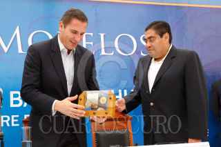 TEHUACÁN, PUEBLA, 30SEPTIEMBRE2013.- El Cabildo de Tehuacán, Puebla le otorgó el reconocimiento ¨Moneda Conmemorativa¨ con motivo de los dos centenarios de Morelos en Tehuacán al senador Miguel Barbosa Huerta. La medalla fue entregada por Rafael Moreno Valle, gobernador de Puebla y Eliseo Lezama Prieto, alcalde de Tehuacán. FOTO: CUARTOSCURO.COM