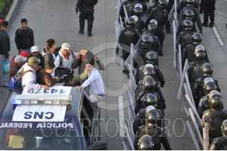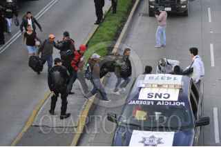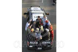 MÉXICO, D.F., 01OCTUBRE2013.- Turistas y trabajadores que se vieron afectados por el bloqueo de los maestros de la CNTE sobre Boulevard Puerto Aéreo son trasladados en camionetas de la Policia Federal para no retrasarse en sus recorridos. FOTO: DIEGO SIMÓN SÁNCHEZ / CUARTOSCURO.COM