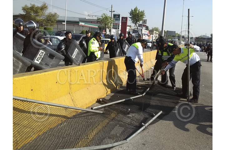 MÉXICO, D.F., 01OCTUBRE2013.- Maestros de la CNTE bloquearon las inmediaciones del Aeropuerto Internacional de la Ciudad de México (AICM). El bloqueo abarcó desde Boulevard Puerto Aéreo, Oceanía, Circuito Interior, Eje 4 y Calle 7. Autoridades informan que han logrado replegar al cuerpo de docentes, quienes han hecho un alto total a la altura de Ignacio Zaragoza, se prevé que reanuden la marcha hacia la Secretaría de Gobernación. Los carriles de Circuito Interior han quedado liberados, se registra saldo blanco. FOTO: DIEGO SIMÓN SÁNCHEZ / CUARTOSCURO.COM