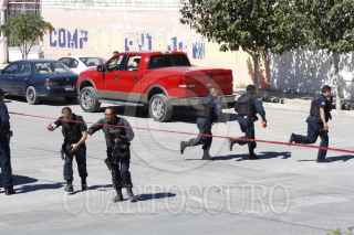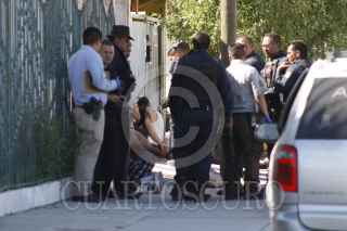 CIUDAD JUÁREZ, CHIHUAHUA, 01OCTUBRE2013.- Una pareja que esperaba a que salieran los niños de una escuela particular fueron emboscados por hombres armados en la colonia Aztecas. El hecho delictivo ocurrió en el cruce de las calles Tarascos y Tetzalez, donde sicarios se acercaron a la pick up Lobo de reciente modelo que tripulaban los padres que esperaban a que salieran de la escuela Instituto Vicentino, cuando los gatilleros dispararon a corta distancia. El conductor de aproximadamente 35 años de edad, perdió la vida, mientras que la mujer resultó lesionada por arma de fuego muriendo mas tarde en el hospital. Al lugar llegaron de inmediato agentes municipales y capturaron a tres de los presuntos responsables del asesinato, sin embargo no han sido reveladas las identidades de los detenidos. FOTO: NACHO RUIZ /CUARTOSCURO.COM