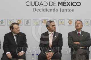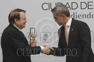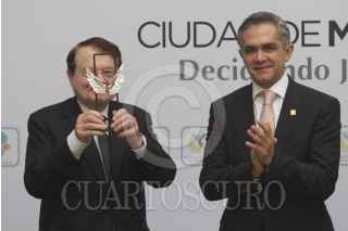 MÉXICO, D.F., 03OCTUBRE2013.- Jean Luc Montagnier, premio nobel de Medicina, fue recibido por Miguel Ángel Mancera, jefe de gobierno del D.F.; y René Druker, en la Clínica Especializada Condesa donde el gobierno local le otorgó la distinción "Alas de la Ciudad". FOTO: IVÁN STEPHENS /CUARTOSCURO.COM