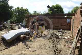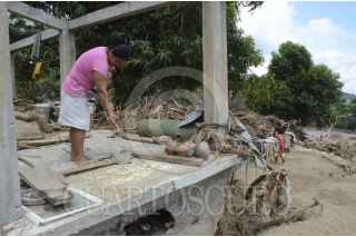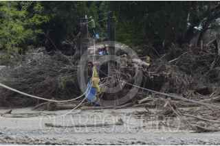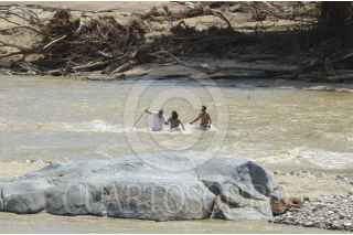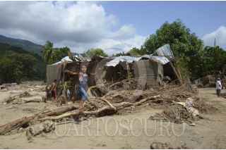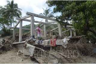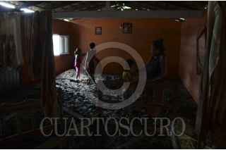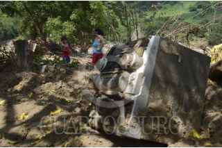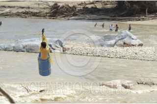 SIERRA DE COYUCA DE BENÍTEZ, GUERRERO, 03OCTUBRE2013.-La mitad de las modestas casas que tenía Barrio Nuevo La Laja, una pequeña comunidad enclavada en la sierra de Coyuca de Benítez, desapareció tras el paso de la tormenta Manuel por las costas guerrerenses. Lo que eran huertas y pastizales que servían para el sustento de sus pobladores ahora son parte del lecho del río Coyuca que amplió su caudal por la fuerza de la corriente que arrasó con todo. Todavía 17 días después de culminadas las torrenciales lluvias permanecen incomunicados, solamente atraviesan las corrientes del río en una tirolesa sujeta de lado a lado mediante un cable de acero al que amarraron de forma improvisada a un tambo y que jalan con mecate para atravesar e ir por víveres. Las familias que perdieron sus viviendas viven refugiados en la escuela primaria del poblado que salvó de las inundaciones junto con la iglesia que se encuentran en la parte más alta. Ambos sitios albergaron a las 140 familias que habitan en Barrio Nuevo La Laja durante el paso de Manuel. Aislado en todo este lapso, apenas recibieron despensas en un helicóptero que aterrizó en el playón más grande que dejo el río, cerca de su comunidad, y de ahí, el cómico Javier Carranza El Costeño llegó junto con Erasmo Catarino llegaron hasta ahí para distribuir víveres. No obstante, sus pobladores que perdieron sus pertenencias duermen en el piso, y demandan el apoyo de cobertores y colchonetas. FOTO: BERNANDINO HERNÁNDEZ /CUARTOSCUOR.COM