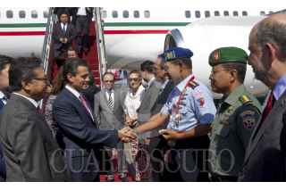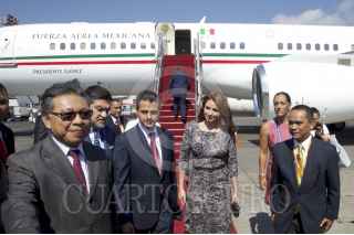 BALI, REPÚBLICA DE INDONESIA, 05OCTUBRE2013. El Presidente Enrique Peña Nieto y su esposa, Angélica Rivera de Peña, arribaron al Aeropuerto Internacional Bali Nigurah Rai, de esta provincia, en la que el Jefe del Ejecutivo participará en la Reunión de Líderes Económicos de APEC 2013, y realizará una Visita Oficial. Fueron recibidos por Sharif Cicip Sutardjo, Ministro de Marina y Pesca; Made Mangku Pastika, Gobernador de la Provincia de Bali; el Embajador Ahmad Rusdi, Jefe de Protocolo de Indonesia y Hamdani Djafar, Embajador de la República de Indonesia, así como el Embajador Carlos de Icaza, Subsecretario de Relaciones Exteriores de México; la Embajadora de México en Indonesia, Melba Pría; y el Embajador Alfredo Pérez Bravo, Jefe de Protocolo de la Cancillería mexicana. FOTO: PRESIDENCIA /CUARTOSCURO.COM