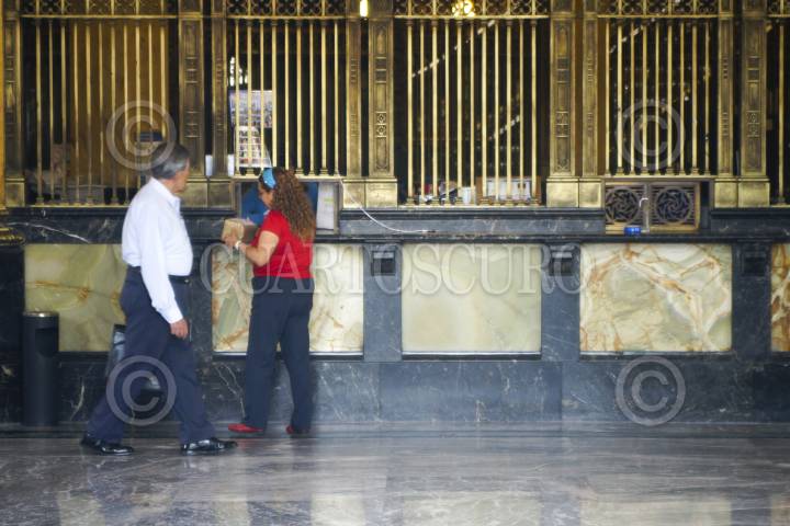 MÉXICO, D.F., 09OCTUBRE2013.- En el día internacional del correo se presencia un desolado Palacio Postal en donde una señora recibe un paquete. En el patio de Carteros del Palacio Postal y con motivo del Día Internacional del Correo, la Secretaría de Comunicaciones y Transportes y el gobierno del DF conmemoraron este día con una ceremonia en la que reconocieron la labor histórica de los carteros en el mundo y en nuestro país. En la actualidad las cartas a mano escrita han sido substituidas por las nuevas tecnologías de la información como el Internet , el correo electrónico, las redes sociales y el chat; mismas que amenazan con la desaparición del correo postal. FOTO: ALEJANDRO NEYRA /CUARTOSCURO.COM