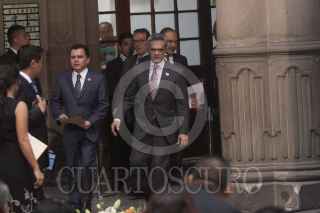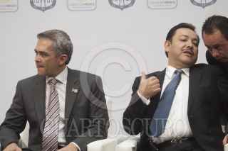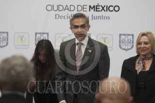 MÉXICO, D.F., 10OCTUBRE2013.- Héctor Serrano, secretario de Gobierno, Oliva Garza de los Santos, presidenta de la Comisión de Reclusorios de la ADF, Miguel Ángel Mancera, Jefe de Gobierno y José Ramón Amieva, consejero Jurídico, firmaron el convenio de otorgamiento de fianzas de interés social en materia penal para procesados de bajos recursos, en el patio del Antiguo Palacio del Ayuntamiento. FOTO: MOISÉS PABLO /CUARTOSCURO.COM
