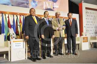 MÉXICO, D.F., 11OCTUBRE2012.- Jesús Zambrano Grijalva, Gustavo Madero, presidentes nacionales del PRD y del PAN respectivamente, Dante Caputo, excanciller argentino, y Cesar Camacho Solís, líder nacional del PRI, asistieron al panel sobre “Acuerdos Políticos y Gobernabilidad Democrática” en el Colegio México, esto en el marco del IV Foro de la Democracia Latinoamericana que organiza el Instituto Federal Electoral (IFE). FOTO: CUARTOSCURO.COM
