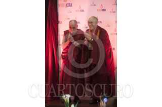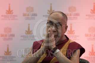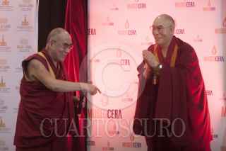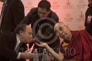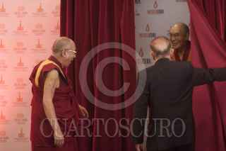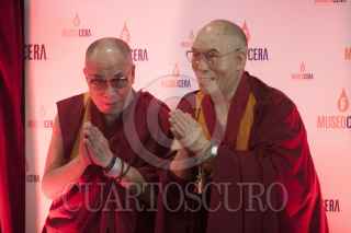 MÉXICO, D.F., 11OCTUBRE2013.- Tenzin Gyatso mejor conocido como el Dalai Lama, líder espiritual del budismo y del Tibet, ofreció una conferencia de prensa al llegar a nuestro país en donde cumplirá una extensa agenda de actividades. Su Santidad fue cuestionada en torno al clima de violencia que vive nuestro país a lo que contesto que solo con amor se puede revertirla y que la violencia es parte de las semillas que hemos venido sembrando. Al finaliza el encuentro con los medios de comunicación se encontró consigo mismo, en una replica de su imagen en cera la cual sea colocada en el Museo de Cera. FOTO: MOISÉS PABLO /CUARTOSCURO.COM