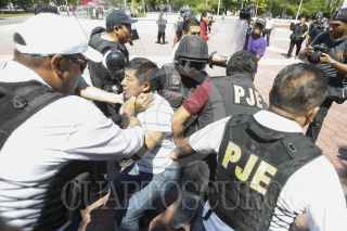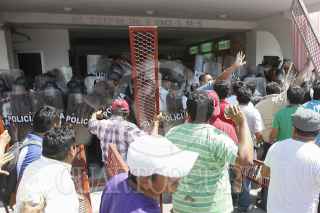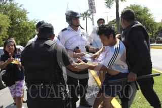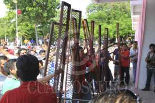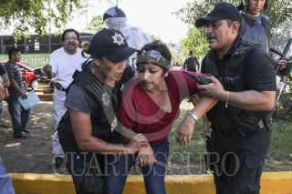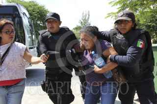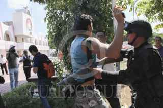 CANCÚN, QUINTANA ROO, 14OCTUBRE2013.- Maestros fueron desalojados por policías antimotines luego de que ingresaron al Palacio del Ayuntamiento a exigir un diálogo con las autoridades. FOTO: ELIZABETH RUIZ /CUARTOSCURO.COM