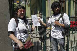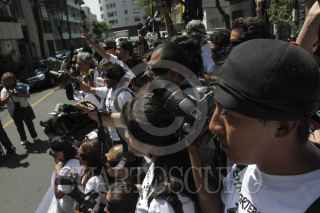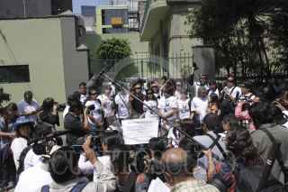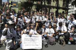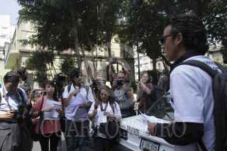 MÉXICO, D.F., 14OCTUBRE2013.- Fotógrafos y reporteros de diversos medios de comunicación e independientes se manifestaron en la representación del Gobierno del Estado de Veracruz, para exigir que se respeten los derechos a la información, así como la represión y acoso a los comunicadores en ese Estado, ya que desde el inicio del gobierno, encabezado por Javier Duarte Ochoa, se han asesinado a 9 periodistas y 3 se encuentran en calidad de desaparecidos. FOTO: JUAN PABLO ZAMORA /CUARTOSCURO.COM
