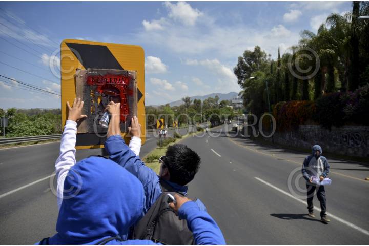 MORELIA, MICHOACÁN, 15OCTUBRE2013.- Más de 2 mil alumnos de las diferentes escuelas normales del estado marcharon en la capital del estado por las principales avenidas. Los estudiantes se trasladaron en más de 37 autobuses que fueron retenidos en días pasados por la normal de Tiripetío y Cherán. FOTO: ALÁN ORTEGA /CUARTOSCURO.COM