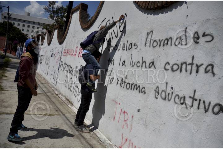 MORELIA, MICHOACÁN, 15OCTUBRE2013.- Más de 2 mil alumnos de las diferentes escuelas normales del estado marcharon en la capital del estado por las principales avenidas. Los estudiantes se trasladaron en más de 37 autobuses que fueron retenidos en días pasados por la normal de Tiripetío y Cherán. FOTO: ALÁN ORTEGA /CUARTOSCURO.COM
