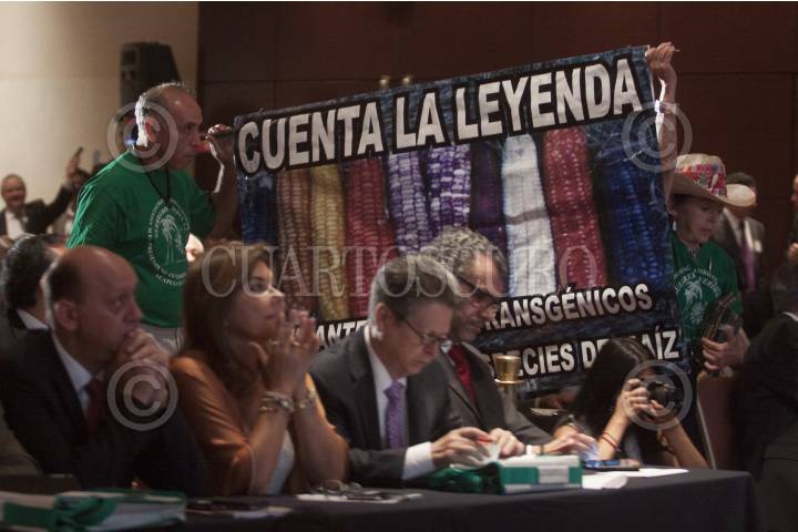 MÉXICO, D.F., 16OCTUBRE2013.- Integrantes Asociación Ambientalista Guerreros Verdes se manifestaron con una manta que se opone a la siembra de maíz transgénicos se manifestaron durante la foro "Sistemas Alimentarios Sostenibles. Una política integral de seguridad alimentaria y nutricional" en el marco del Día Mundial de la Alimentación, evento inaugurado por el secretario de Agricultura Enrique Martínez y Martínez. FOTO: MOISÉS PABLO /CUARTOSCURO.COM